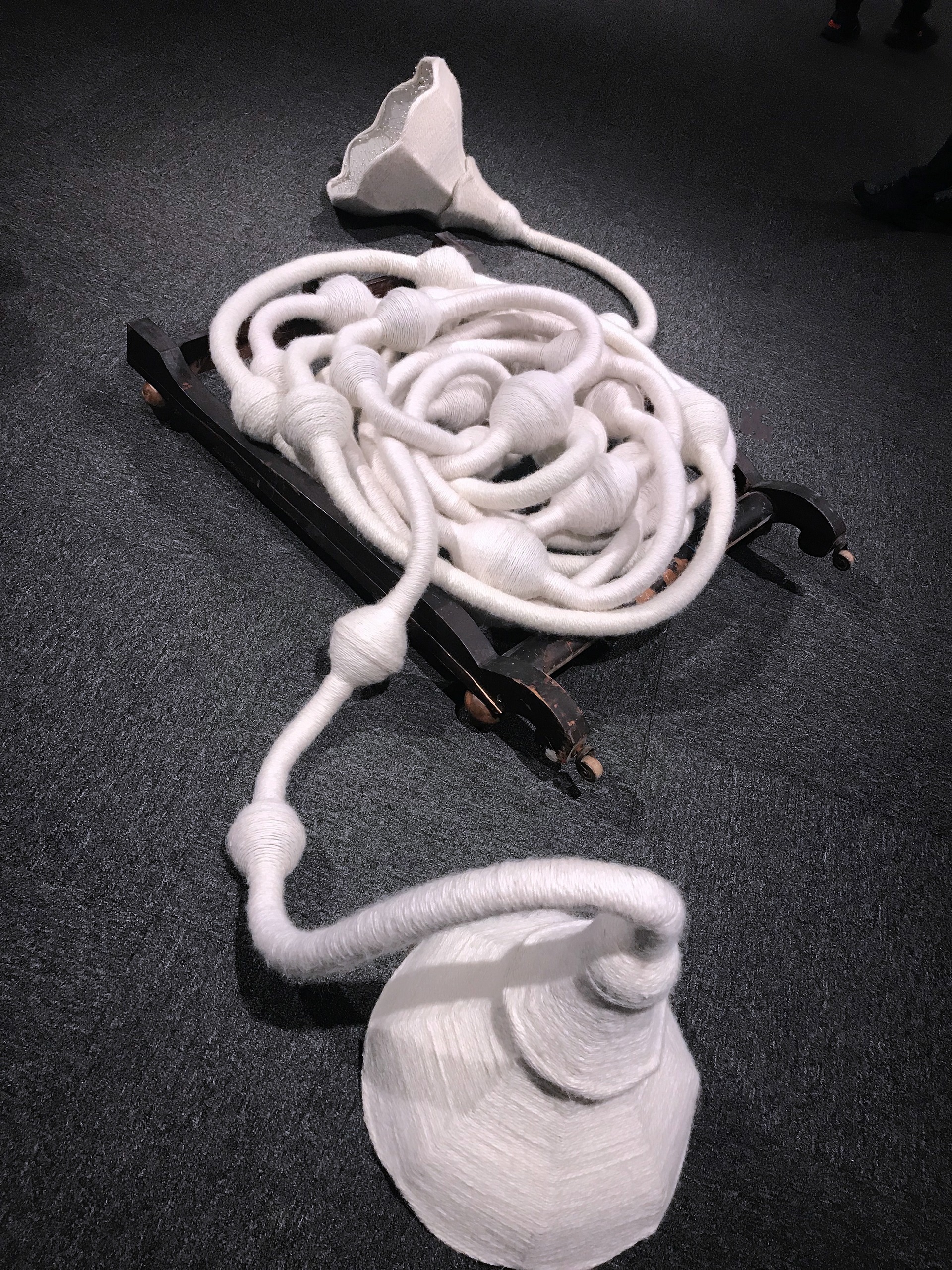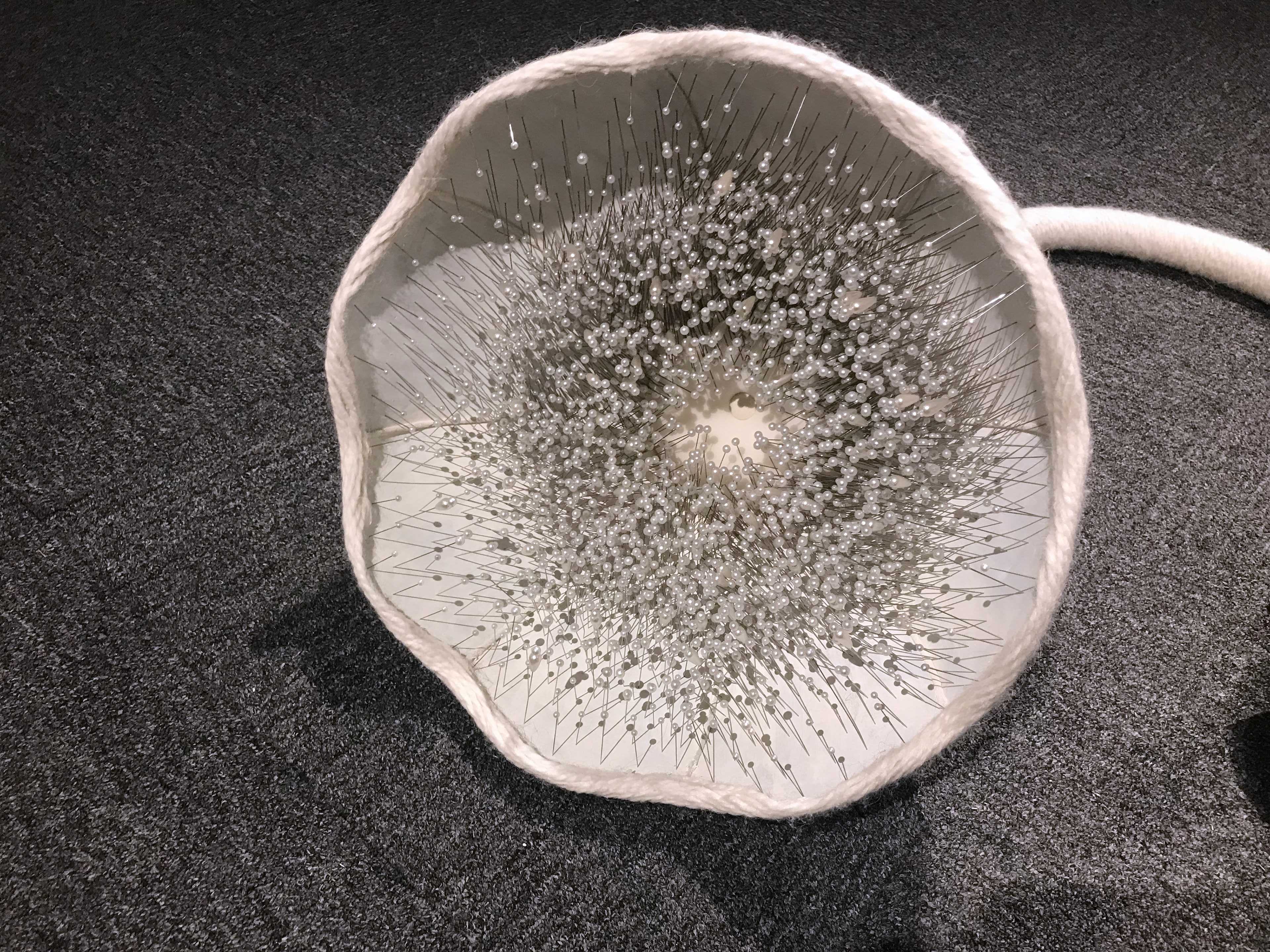 Funnels, pins, bed frame fragments, lampshades, meat-flavor injector, silicone, & various fibers 2018 “More often than not, the ideal breast is an invented breast.” During World War II, Japanese concubines injected their breasts with liquid silicone in order to be more appealing to American soldiers. This military grade silicone, that the women obtained, contained additives like olive oil and cobra venom. Due to the unsanitary nature of this substance, when used the injection site would develop ‘silicone rot’ - a strain of gangrene. Later on, the liquid silicone would break apart in the woman’s body, forming lumps within the breast.