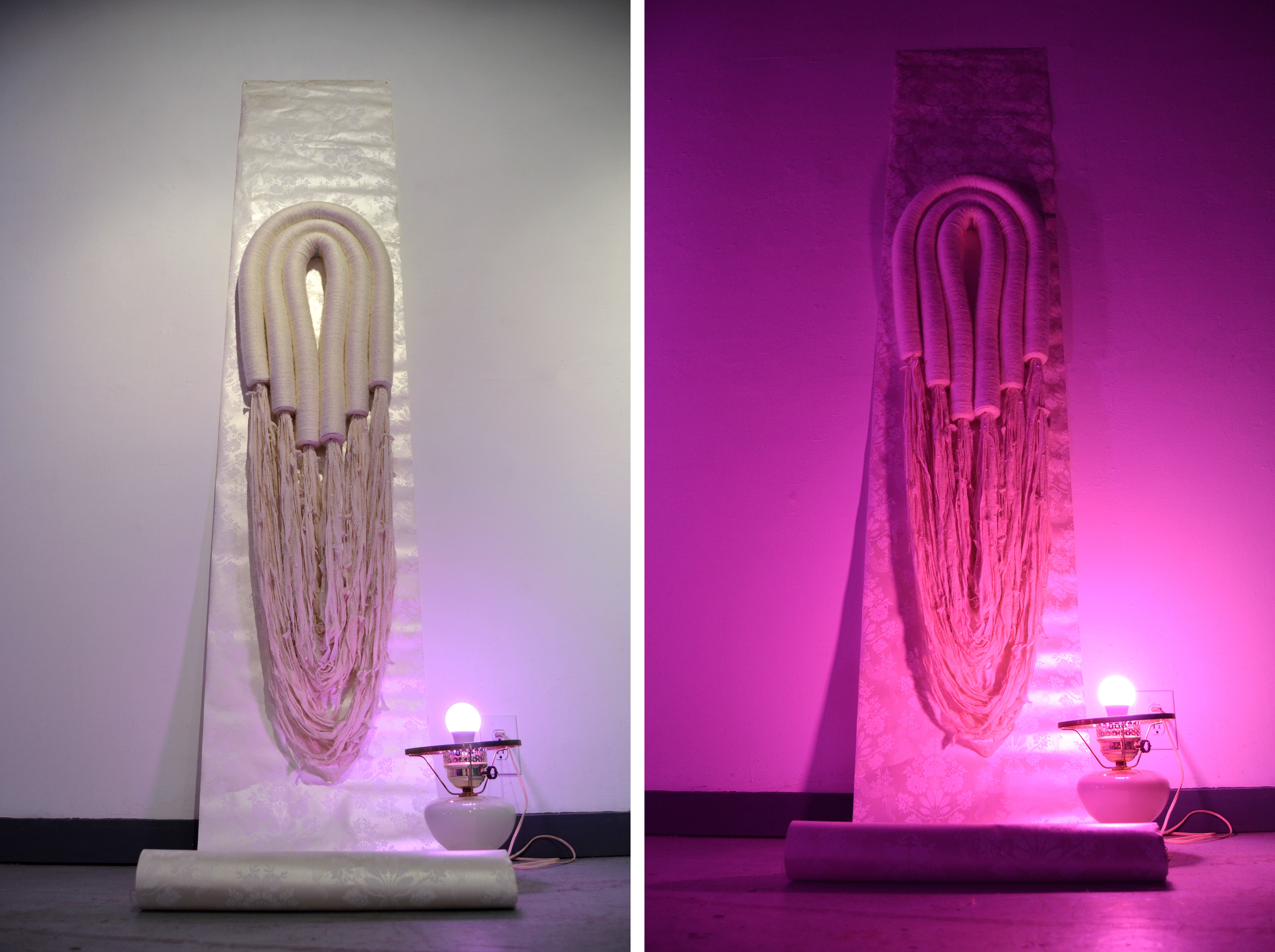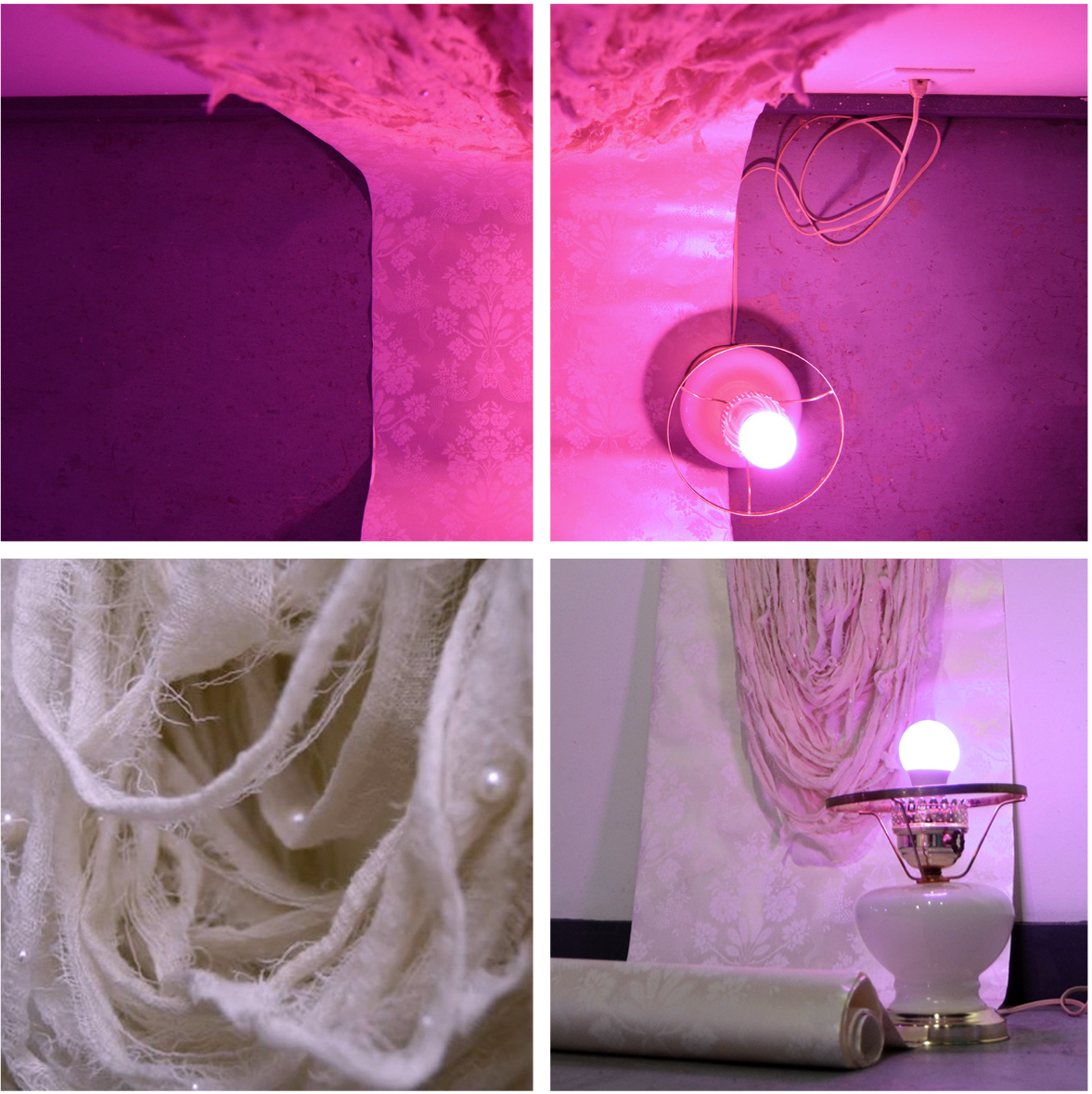 Adhesive pearls, vintage silkscreened wallpaper, antique hobnail lamp, metal, foam & various fibers 2013-2018 "We turn skeletons into goddesses and look to them as if they might teach us how not to need." This work is inspired by a time in the 1930's, where English women intentionally swallowed tapeworms to lose weight. The tattered cream fibers are meant to reference the bodies of the tapeworms. While the adhesive pearls and the form of the piece represent the overlapping strands of pearl necklaces - popular fashion accessory during the time.