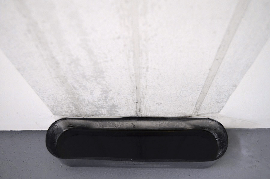 Poured aluminum, shoe polish, plastic, glass, & pigmented oil 2013 Adopting the foundry technique of lost wax casting, I hand poured aluminum pieces.Referencing the ornamental repoussé technique, I stamped floral patterns into the outer rim of the works. When installed the work leaks pigmented black oil. Working with the industrial nature of the material, I wanted to convey the mechanical nature of the woman’s reproductive system.