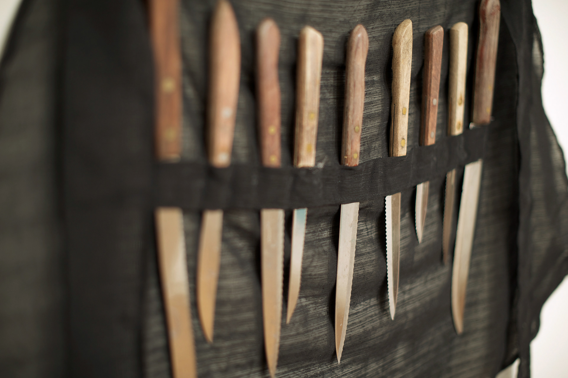 Knives, laminate tiles, wood, mop, pale, trash can, plastic bag, fibers & found objects 2011 “Love is a game in which one always cheats (Balzac).” Honey I’m Home! Is a series modeled after what a house wife might do if she found out her husband was having an affair. The work revolves around this “To Do List” the wife has put together to remind herself of the tasks she needs to complete. This list is based off the expectations of a 50’s house wife, which was to cook, clean, and take care of their husband.