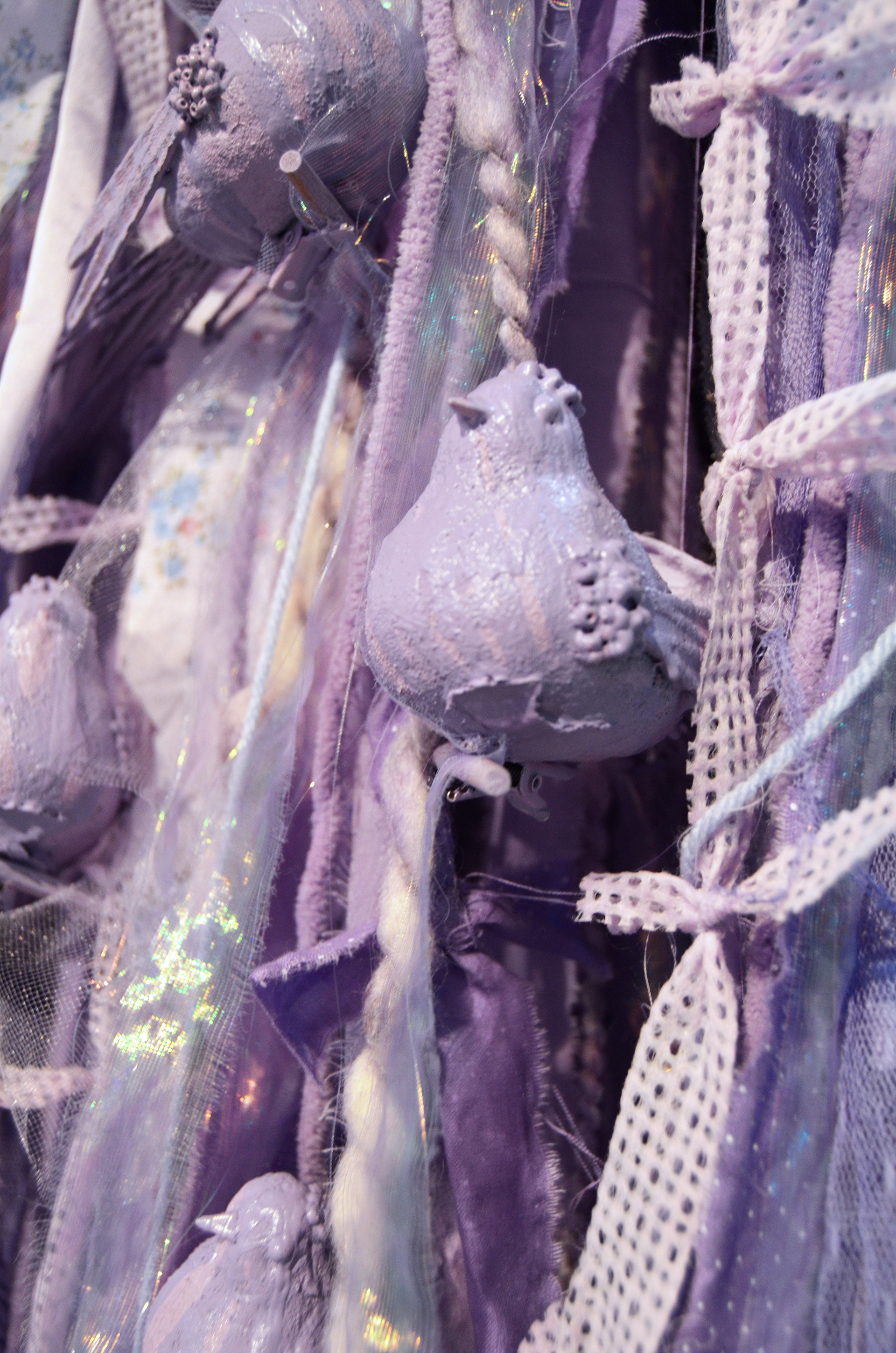 Makeup wipes, artificial birds, birdcages, birdcage veil, chopsticks, paint, lampshades, clothespin, metal, various fibers & audio element of the Nightingale’s song combined with rubbing lotion 2018 “A tree may look as beautiful as ever; but when you notice the insects infesting it, and the tips of the branches that are brown from disease, even the trunk seems to lose some of its magnificence.” Nightingale feces (uguisu no fun) have been used in facial pastes since ancient Japanese times. Historically, Geishas used it to remove their heavy makeup and to whiten their skin. Due to this, ‘uguisu no fun’ is commonly referred to as the ‘Geisha facial.’
